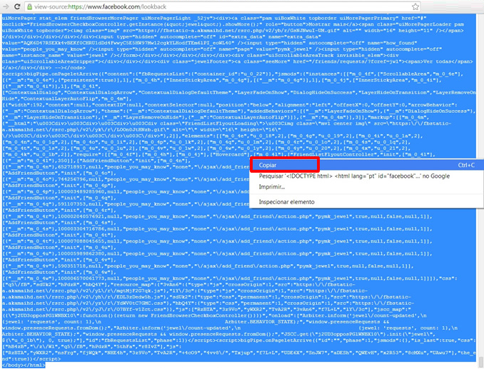 Passo 3. Selecione o código do início ao final da página, clique com o botão direito do mouse na opção “Copiar”. Ou aperte “CTRL A” (selecionar tudo) e em seguida “CTRL C” (copiar);