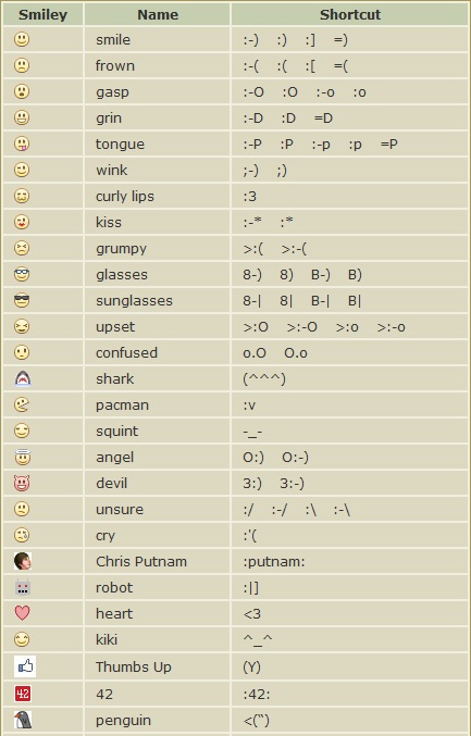 O site fbsmileys.com criou uma lista com todos os atalhos de emoticons disponíveis no Facebook. Tem os atalhos para os mais básicos, como a carinha de feliz “:)”, ou triste “:(“, e até algumas figuras divertidas como um tubarão, um robô, um pinguim e até Chris Putnam – um hacker que programou um vírus para o Facebook, em 2005, que transformava a interface da rede no antigo estilo do MySpace e que, depois da “brincadeira”, acabou contratado por Mark Zuckerberg.