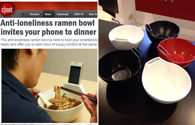 Um estúdio de design criou tigelas com entrada para iPhone para facilitar a vida dos usuários que gostam de navegar na internet enquanto jantam. Criadas pelo estúdio Miso Soup Design, liderado por Daisuke Nagatomo, do Japão, e Minnie Jan, dos Estados Unidos, as tigelas ‘antissolidão’ ainda não estão disponíveis para venda. Conforme a página do estúdio no Facebook, a tigela feita para ‘ramen’, tradicional receita de macarrão japonês, começará a ser vendida em breve.