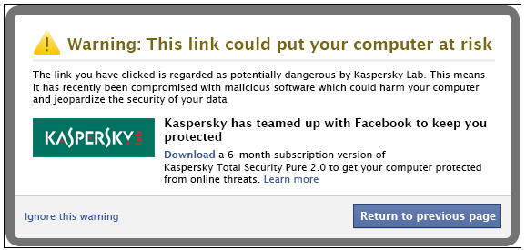 Se o link coincide com a lista do Facebook de “known-bad” URLs – que a Kaspersky Lab e outros fabricantes de segurança disponibilizam ao Facebook – o utilizador é de imediato notificado e o acesso a essa página será bloqueado. Isto não só evita que o equipamento e dados pessoais do utilizador corram riscos, como ainda evita que os links maliciosos se propaguem.