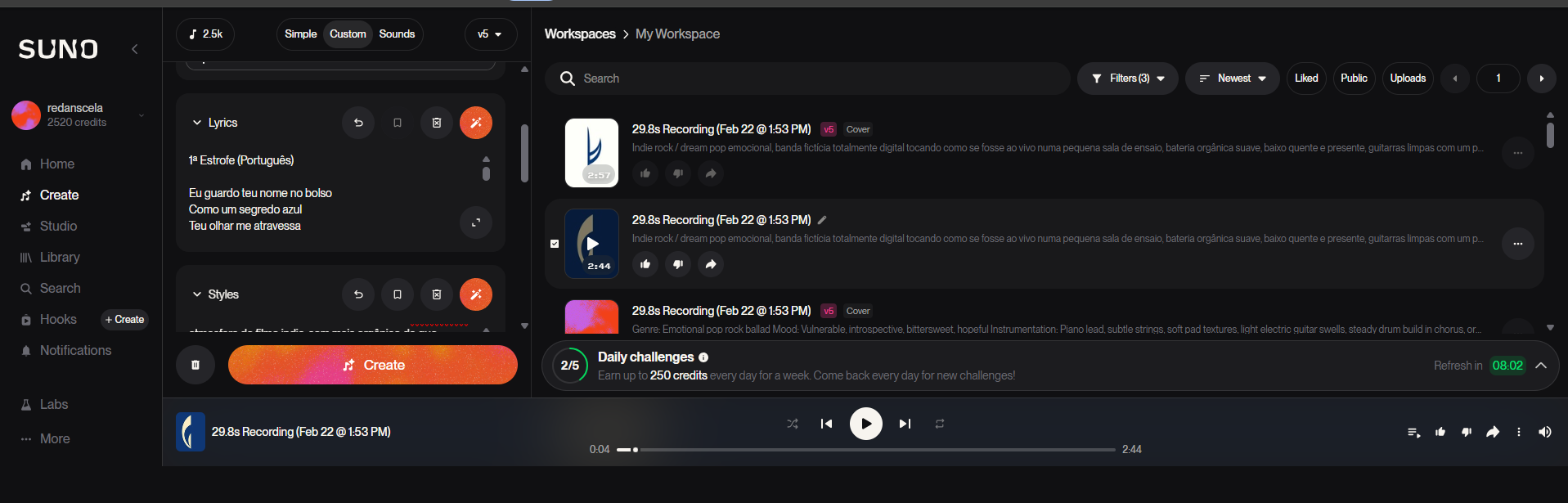 Para testar a plataforma, voltei aos tempos da banda Sptiz (uma banda que eu fazia parte e criava algumas das letras) e criei uma letra original com mistura de línguas (português, inglês e espanhol), explorando temas como mistério, paixão e presença constante (utilizei o ChatGPT para traduzir para o inglês es espanhol).